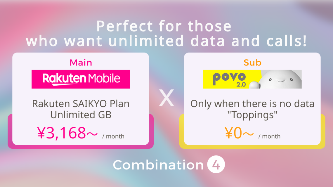 Basically, I use Rakuten Mobile for everything, and have povo2.0 as a backup for areas with poor signal reception.