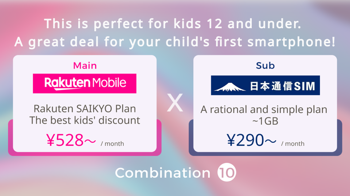 A recommended solution that meets these conditions is a dual-SIM setup using Rakuten Mobile (Strongest Kids Discount) + Japan Communications SIM (1GB plan).